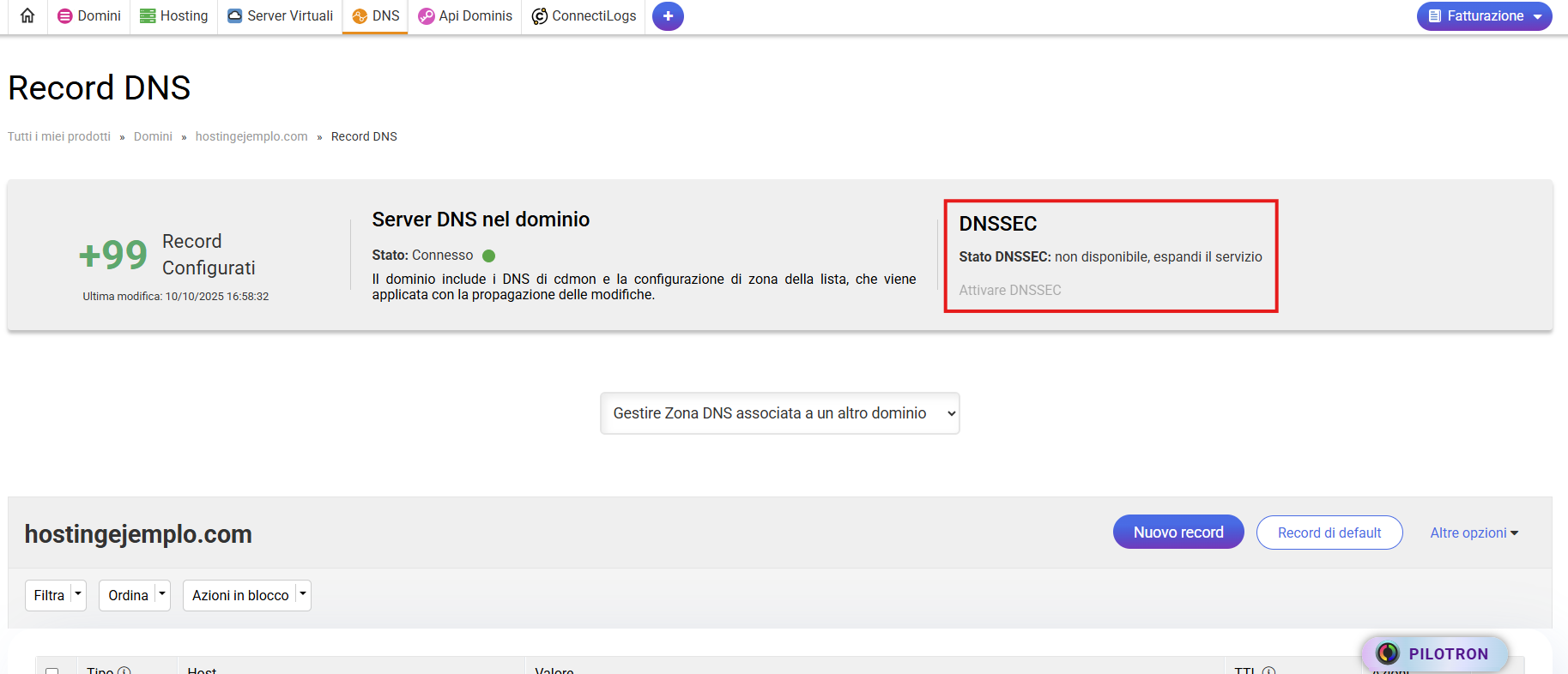 In questa schermata abbiamo bloccato il pulsante Abilita/disattiva DNSSEC che è l'unica azione che entraIn conflitto con la manutenzione di un dominio, il resto delle azioni sono ancora disponibili durante questo processo, è possibile creare, modificare ed eliminare record senza problemi: