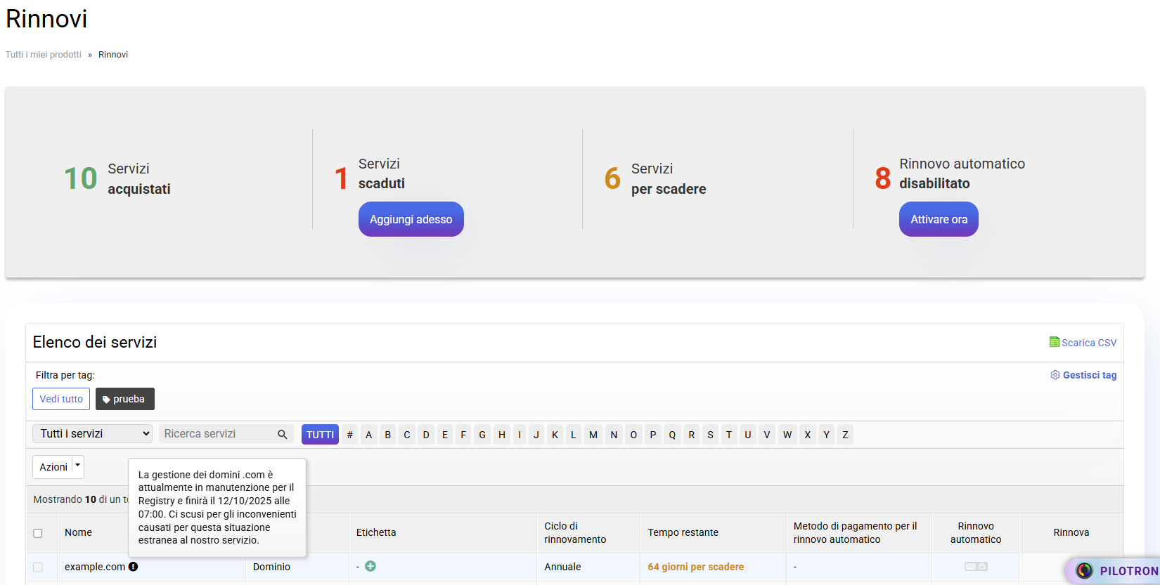 In questo caso, l'unica azione che non può essere intrapresa è Rinnovare un dominio in manutenzione, ma per evitareincoerenze con altre possibili azioni, abbiamo bloccato la possibilità di intraprendere qualsiasi azione correlatacon il Rinnovo e rinnovo automatico, abbiamo anche aggiunto un avviso per segnalare lo stato del dominio: