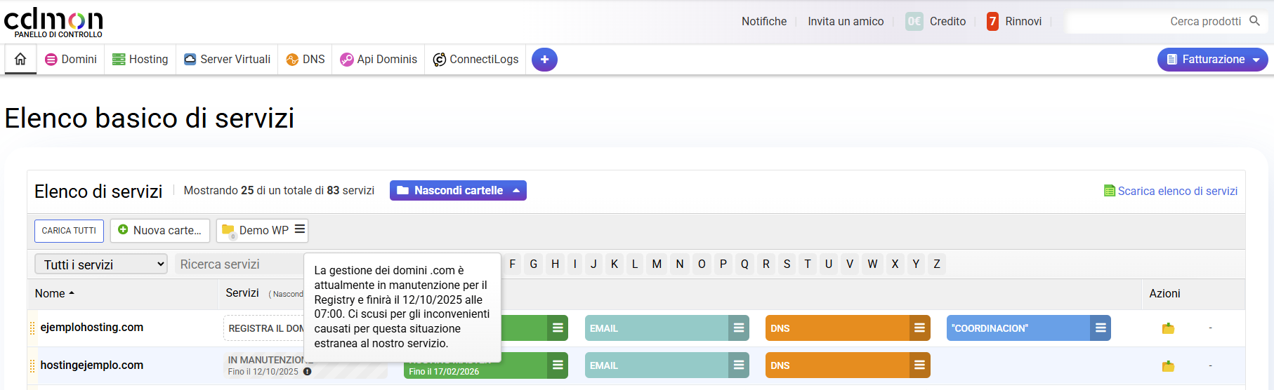 Nel Pannello di controllo abbiamo aggiunto una serie di avvisi da rilevare quando i domini sono in manutenzione.