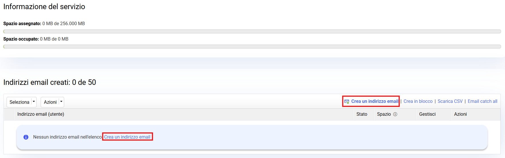 Se il sistema è riuscito a creare l’account email, si aprirà un pop-up che conferma la creazione corretta dell’account e mostrerà una serie di azioni disponibili: