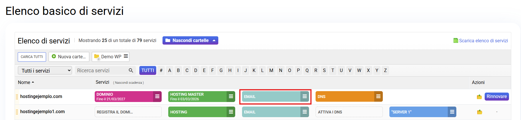 Indipendentemente dal piano contratto, nell’elenco base dei servizi troverai l’opzione POSTA, in questo caso un piano Senior con il nome associato example.com.