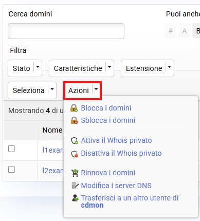 Trasferimento ad altri utenti cdmon: puoi trasferire ad un altro utente tutti i domini selezionati.