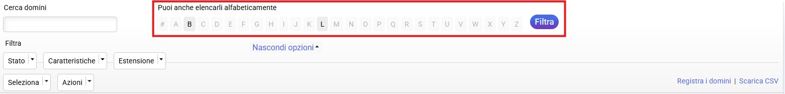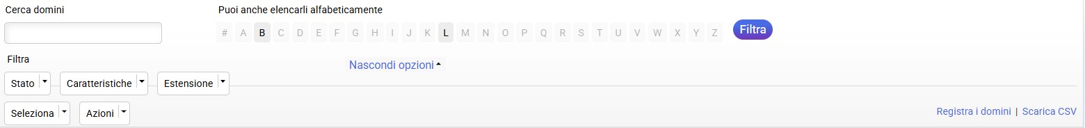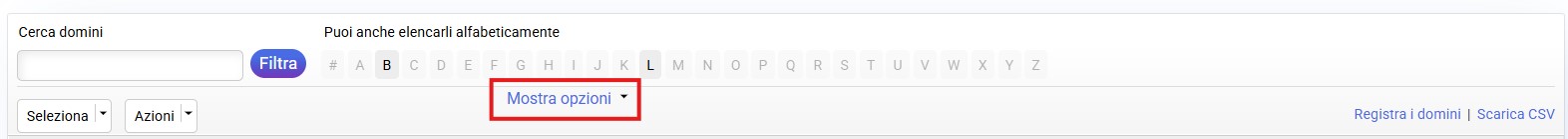 Una volta visualizzato il pulsante "Altre opzioni", è possibile elencare rapidamente ed efficacemente i domini in base al loro stato, attributi o estensione.