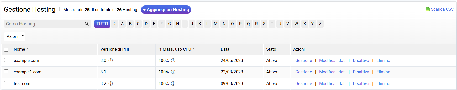 + Aggiungi hosting: modulo per creare un nuovo hosting sul server.
