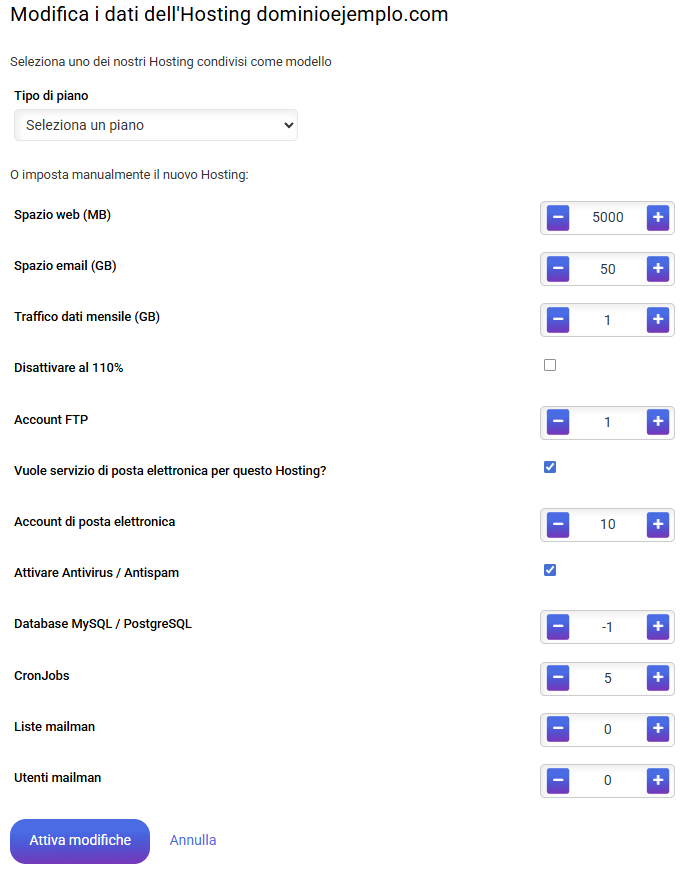 Modifica delle caratteristiche – Una volta qui, apparirà un modulo per modificare le caratteristiche dell’hosting selezionato: