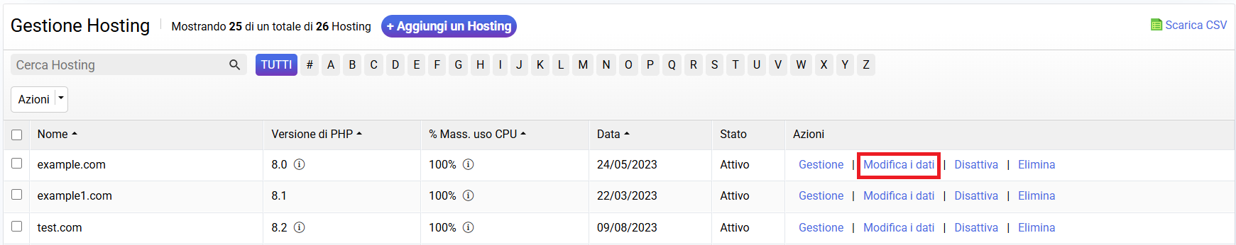 Per modificare un hosting all’interno del server virtuale, è necessario accedere alla gestione del server: