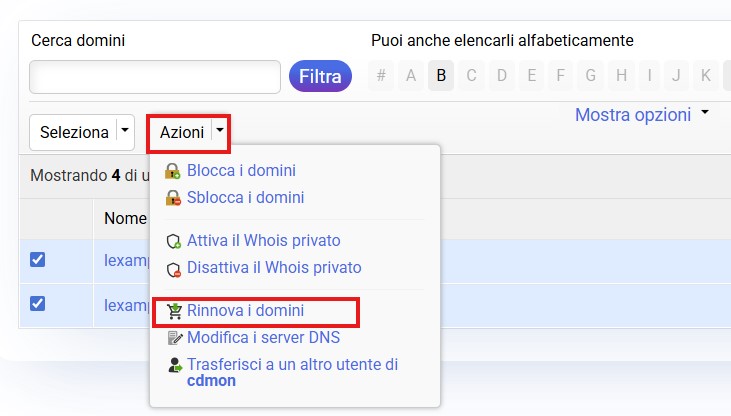 - Nel menu a discesa "Azioni" fare clic sull'opzione Rinnovare domini.