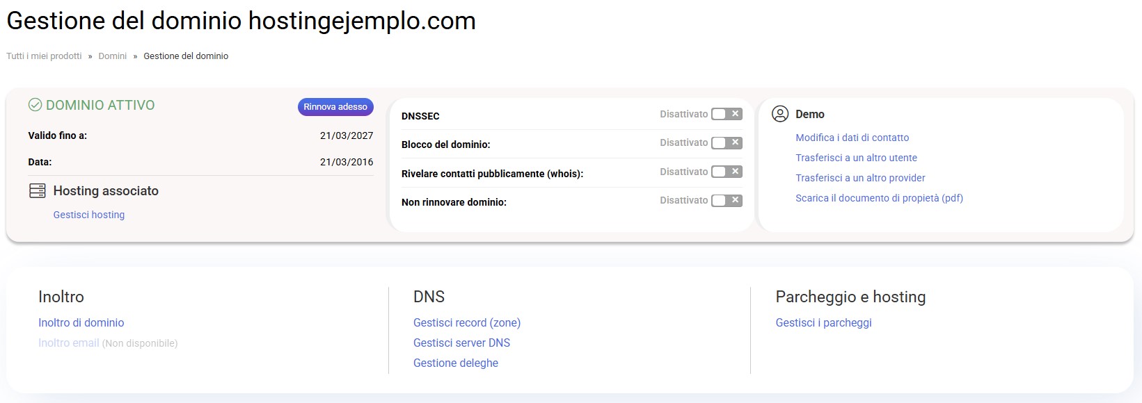 Nella sezione Parcheggio e hosting puoi vedere le seguenti opzioni: