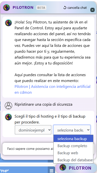 In chat, scrivi un testo come "Ripristinare un backup". Pilotroneti mostrerà le opzioni disponibili e ti guiderà nella selezione del tipo di restauro di cui hai bisogno: