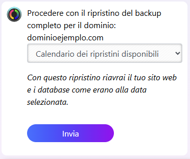 Restauro completo:Il ripristino completo recupera tutti i database e i file nell'hosting e sostituisce il contenuto corrente.