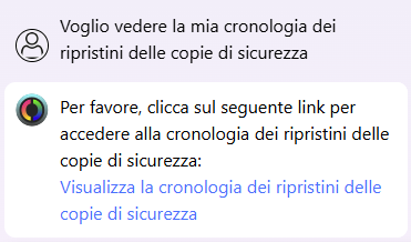Nella chat, scrivi "Voglio vedere i miei restauri di backup". Pilotron allegerà un link per accedere alla "Storica dei restauri effettuati", indicando la data e il tipo di copia ripristinata.