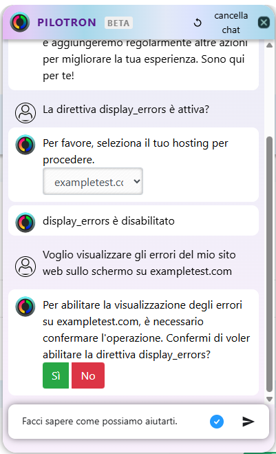 Nel chat, scrivi un testo come "È attiva la direttiva display_errors?" oppure "Voglio mostrare gli errori del mio sito sullo schermo in [nome dell’hosting]".