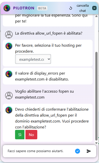 Nel chat, scrivi un testo come "È attiva allow_url_fopen?" oppure "Voglio attivare l’accesso tramite fopen in [nome dell’hosting]".