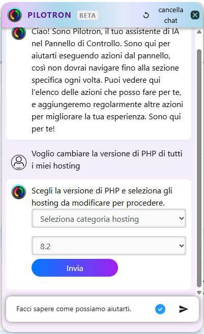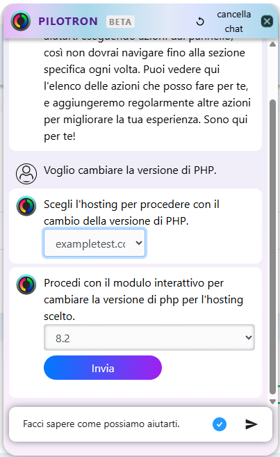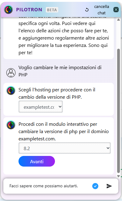 Nel chat, scrivi un testo come " Voglio cambiare la mia versione di PHP " oppure "Cambiare versione di PHP in [nome dell’hosting]". Pilotron ti restituirà un modulo con le versioni di PHP disponibili; puoi selezionare quella desiderata e cliccare su "Invia" per confermare la modifica.