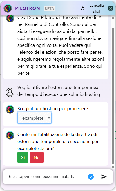 Nel chat, scrivi un testo come " Qual è la mia versione di PHP? " oppure "Quale versione di PHP ho in [nome dell’hosting]". Pilotron ti restituirà la versione PHP assegnata all’hosting indicato.