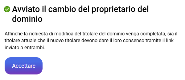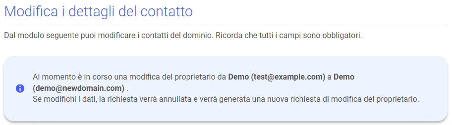 Con le regole ICANN, quando viene modificato il nome o l'e-mail del proprietario di contatto di un dominio, la modifica deve essere convalidata dal contatto corrente e nuovo via e-mail. Quando si modifica l'e-mail del titolare del dominio, il sistema fornisce il seguente messaggio.