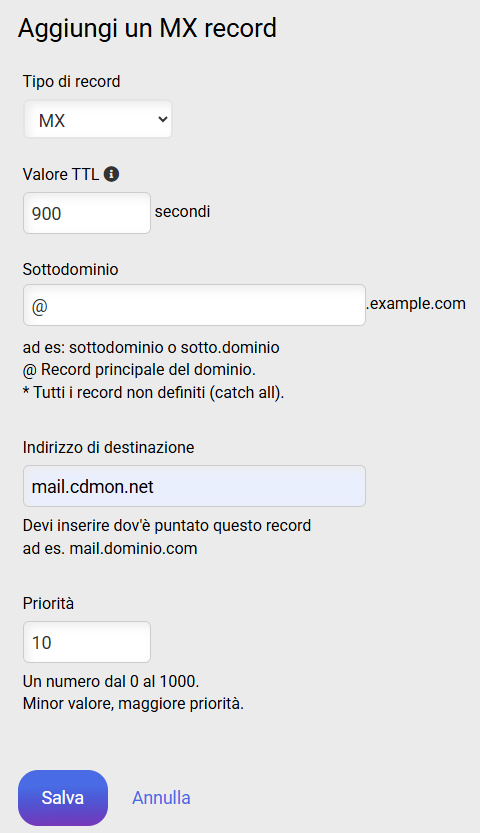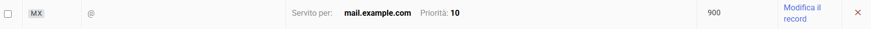 Nota: Se non si dispone di alcun record di tipo MX creato o si dispone di un diverso da quello mostrato nell'immagine, i dati da inserire sono gli stessi, il dominio deve terminare con il seguente record DNS creato: