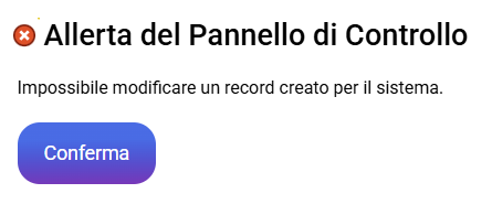 Se si tenta di modificare il record MX creato, la dashboard non lo consentirà, in quanto rileva che si tratta di un record di sistema. In tal caso sarà necessario eliminare il record in questione e ricreare un nuovo record MX con i nuovi dati.
