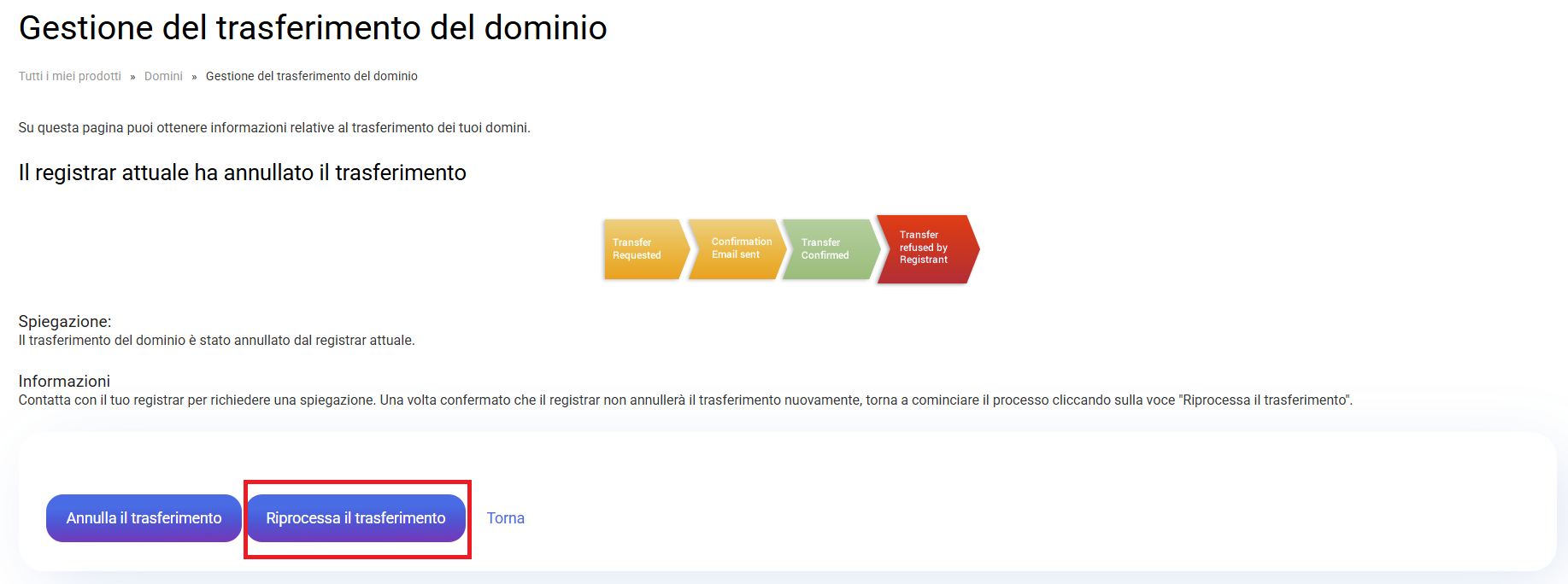 In questa situazione, è possibile accedere alla schermata “Gestisci trasferimento del dominio” e cliccare su Riprocessa trasferimento, affinché il processo venga avviato nuovamente.