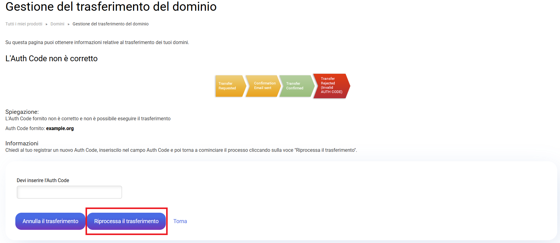 Se il dominio ha generato un errore per Auth Code non corretto, è possibile inserire un nuovo Auth Code dalla schermata di trasferimento, prima di riprocessare la richiesta.