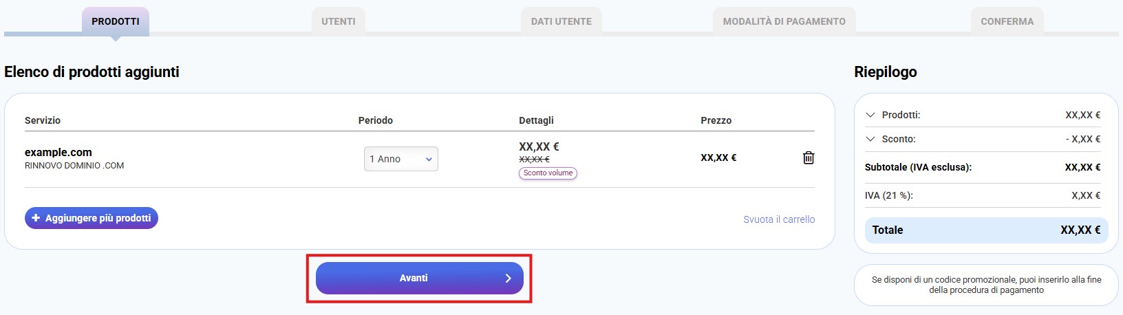 - Nel carrello è possibile selezionare il periodo di rinnovo del dominio e fare clic sull'opzione Prossimo passo successivo proseguire con il processo di pagamento e rinnovo.