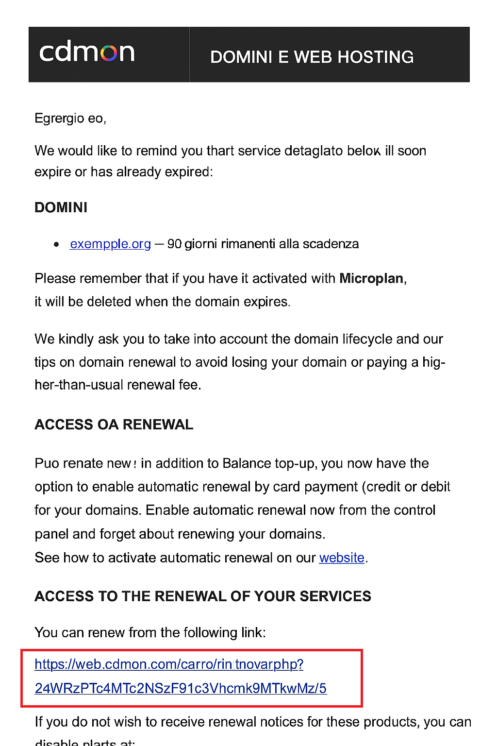 Rinnova dominio dall'e-mail promemoria di rinnovo