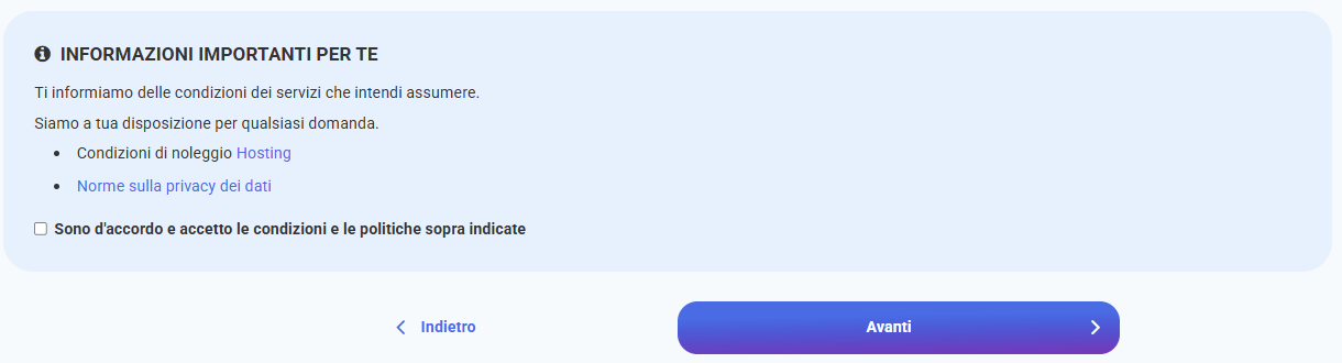 Nel passaggio successivo vedrai un riepilogo dell’ordine: l’elenco dei prodotti da rinnovare, i dati di fatturazione, il metodo di pagamento e le condizioni contrattuali che devi leggere e accettare. Clicca su Passaggio successivo per completare l’ordine.