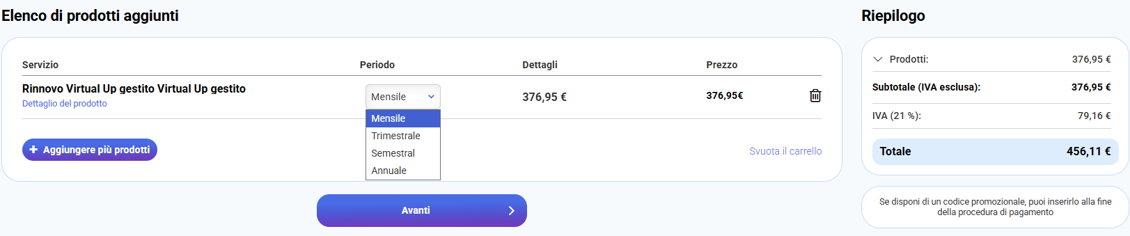 Per impostazione predefinita verrà indicato il periodo “Mensile”, ma puoi modificarlo in “Trimestrale” o “Semestrale” in base alle tue esigenze. Dopo aver verificato i dati del rinnovo, clicca su Passaggio successivo.