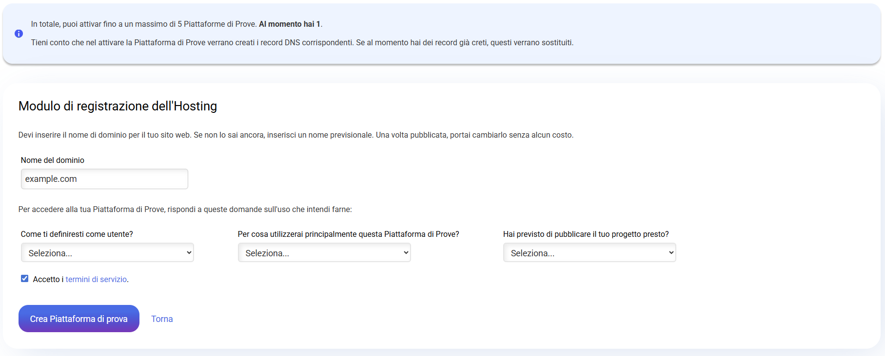È possibile creare un massimo di 5 piattaforme di test per utente.