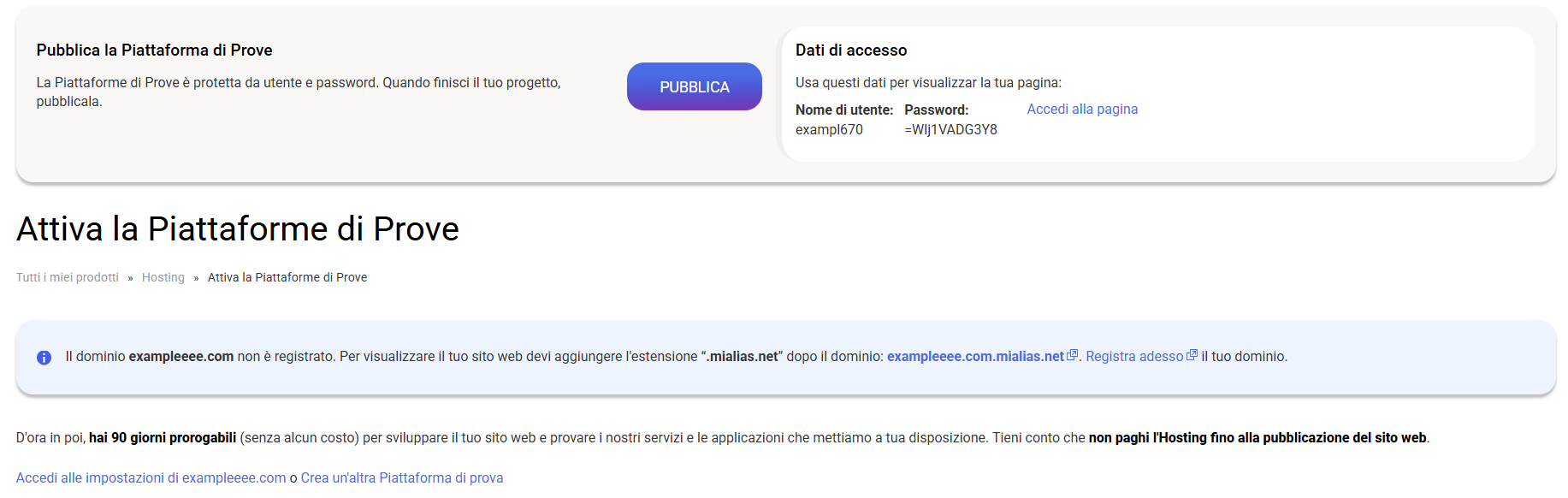 Al termine della creazione apparirà una schermata con informazioni da tenere conto. Come, accedere ai dati, giorni disponibili o se è necessario utilizzare l'estensione ".mialias.net".