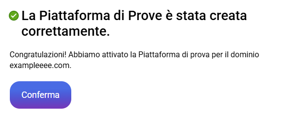 Una volta indicato il dominio, se si accettano le condizioni e selezionare l'opzione "Creare piattaforma di test", inizierà il processo di creazione. Alla fine di un messaggio uscirà indicando che ha avuto successo.