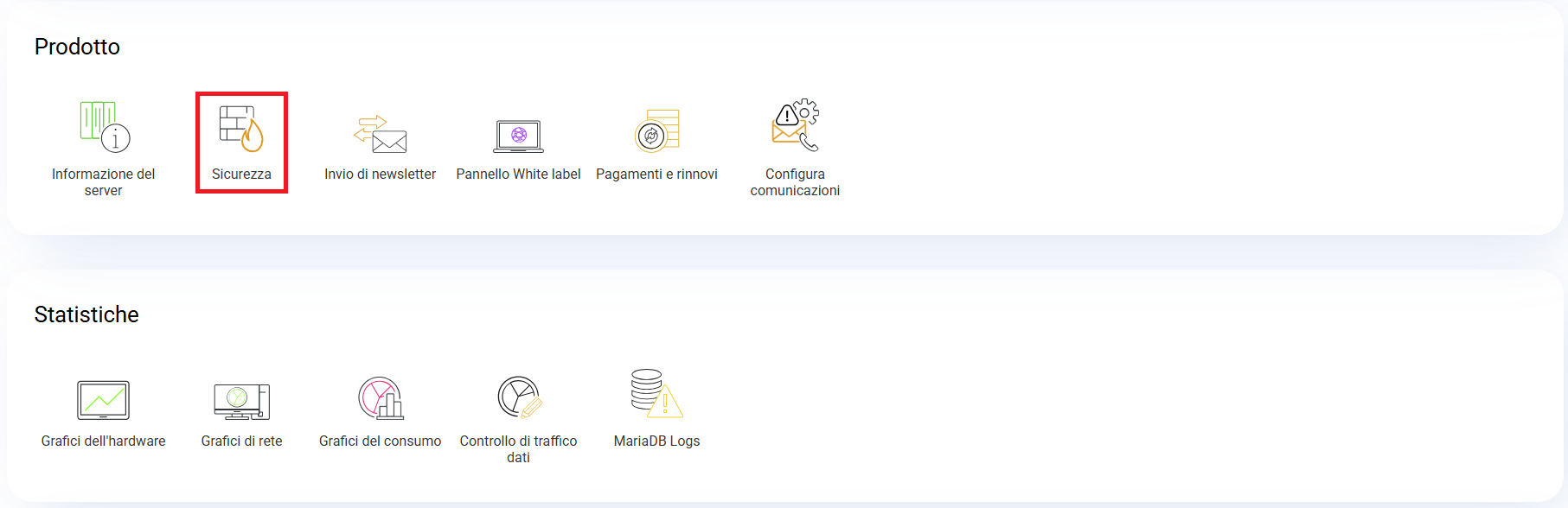 All'interno del server Virtuale Up nel file Sicurezza, puoi attivare o disattivare el lFirewall per applicazioni Web (WAF) per il vostro alloggio. Fare clic sull'opzione Sicurezza nel Virtual Management Board.