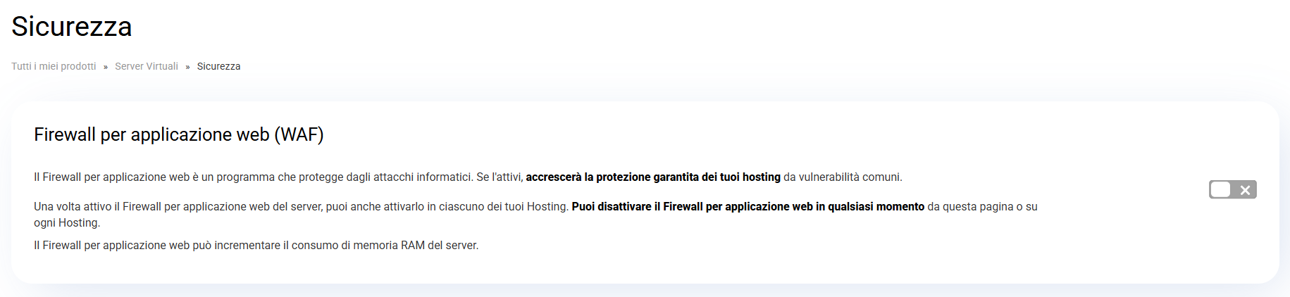 Importante: questa opzione installerà il Firewall per applicazioni Web (WAF) sul tuo server Virtual Up. Questo ti permetterà attivare e disabilitare lo stato del servizio nel vostro alloggio in un modo individuale e massive.